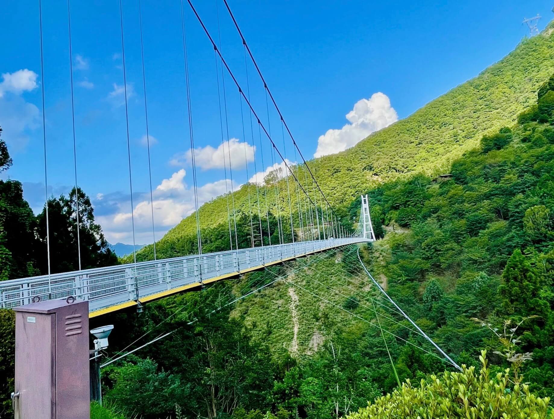 揺れる橋の上から見える渓谷や山並みは圧巻。途中でベンチに座って風を感じたり、記念写真を撮ったり、ゆったりと景色を楽しめます。