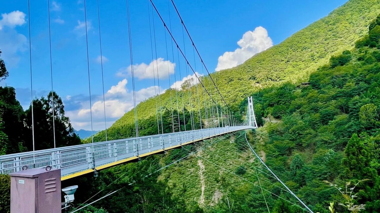 揺れる橋の上から見える渓谷や山並みは圧巻。途中でベンチに座って風を感じたり、記念写真を撮ったり、ゆったりと景色を楽しめます。