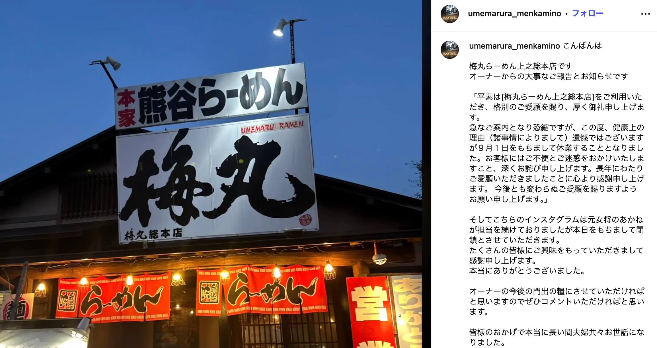 熊谷市上之にある人気ラーメン店『本家熊谷らーめん 梅丸 総本店』が、2025年9月1日より休業に入りました。