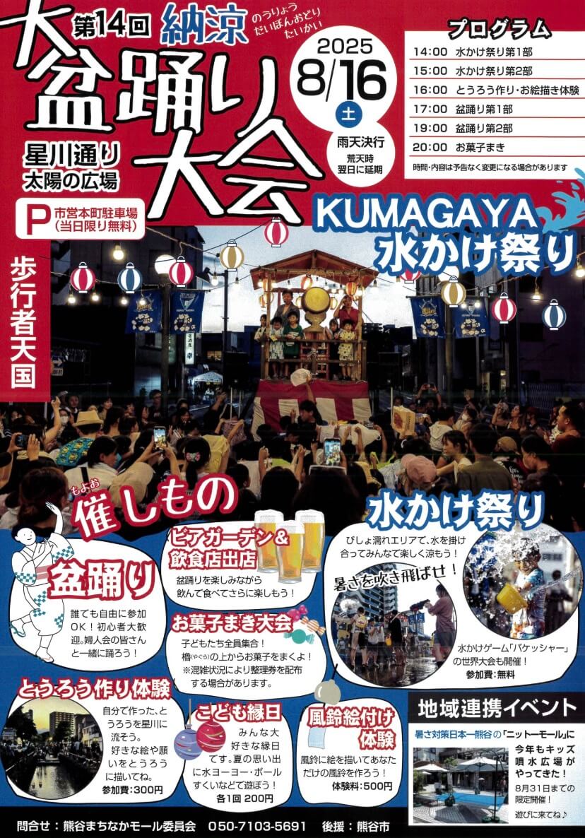 熊谷市・星川通りで開催される夏の風物詩「納涼大盆踊り大会」。水かけ祭りや盆踊り、お菓子まき大会などが行われ、子どもから大人まで楽しめるイベントです。歩行者天国となる会場には屋台や縁日コーナーも登場し、真夏の一日を盛り上げます。