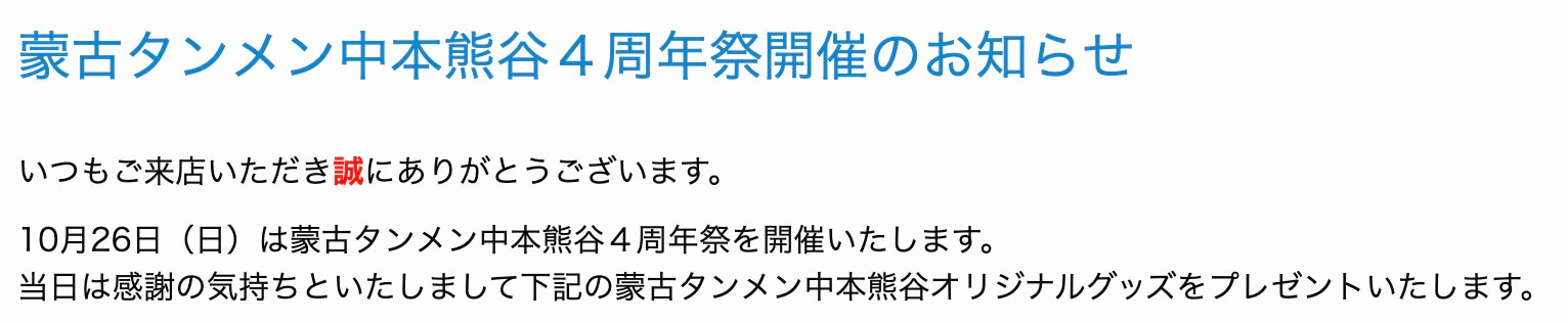 ▼「蒙古タンメン中本 熊谷店」4周年祭の開催に関して(公式サイトより)