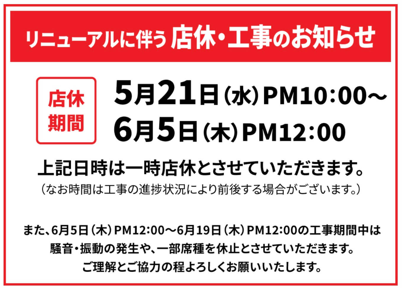 なお、リニューアルに伴い、店舗は2025年5月21日〜6月5日の間、一時休業となり、2025年6月5日昼12時より営業は再開されますが、振動・騒音の発生や一部座席の休止があるとのこと。