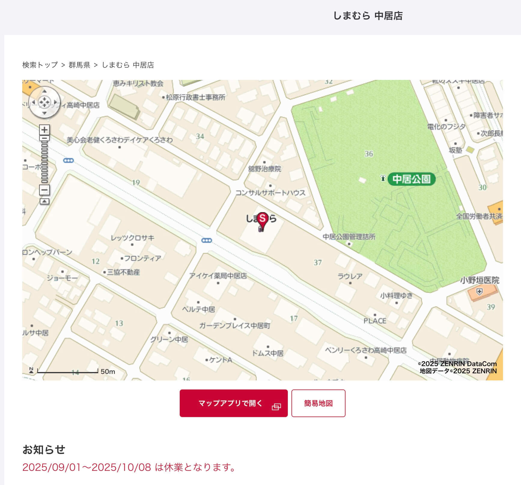 群馬県高崎市中居町の『しまむら 中居店』が、2025年9月1日(月)から10月8日(水)まで休業しています。