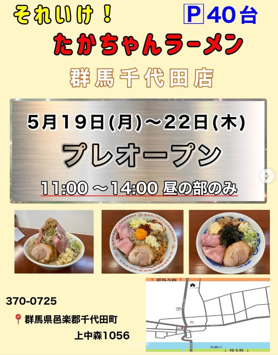 群馬県邑楽郡千代田町に『それいけ!たかちゃんラーメン 群馬千代田店』が2025年5月19日〜22日の期間でプレオープン予定です。