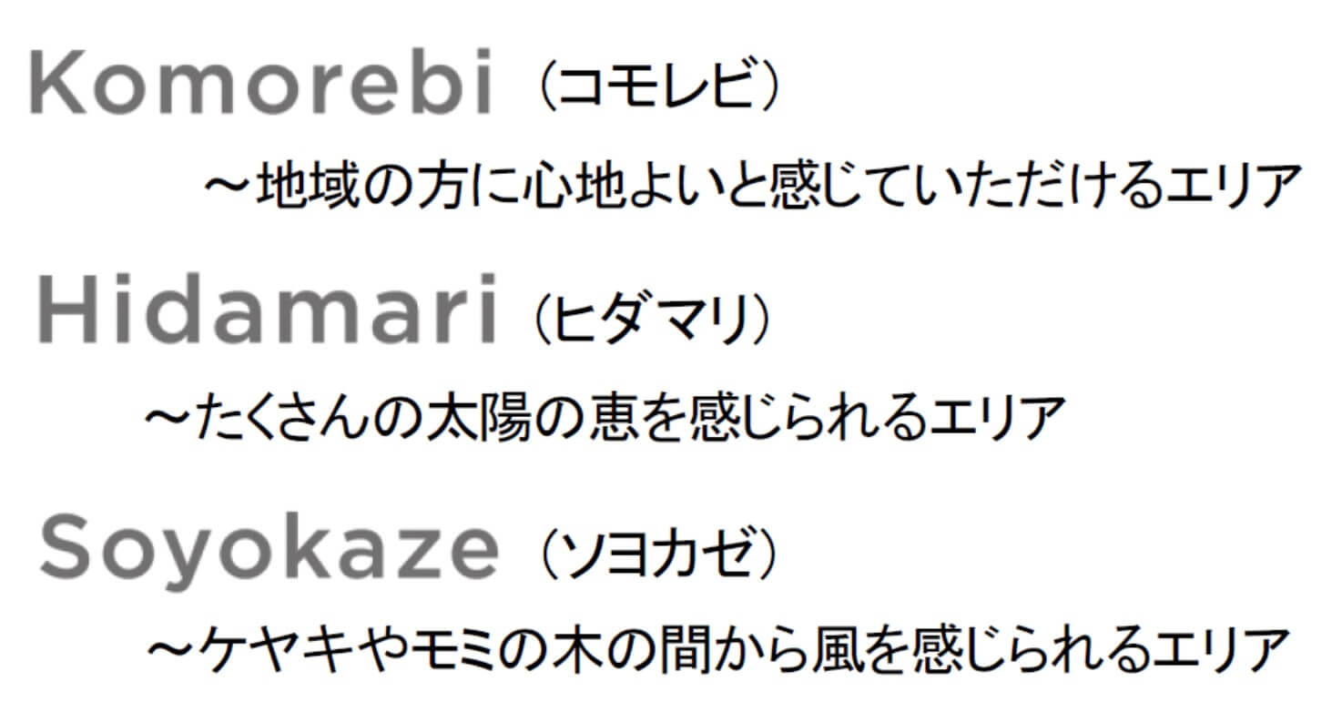 新設される3つの憩いの場「Komorebi」「Hidamari」「Soyokaze」は、買い物の合間に誰でも自由にくつろげる空間として整備され、地域の“日常的な居場所”としての機能も高まりそうです。