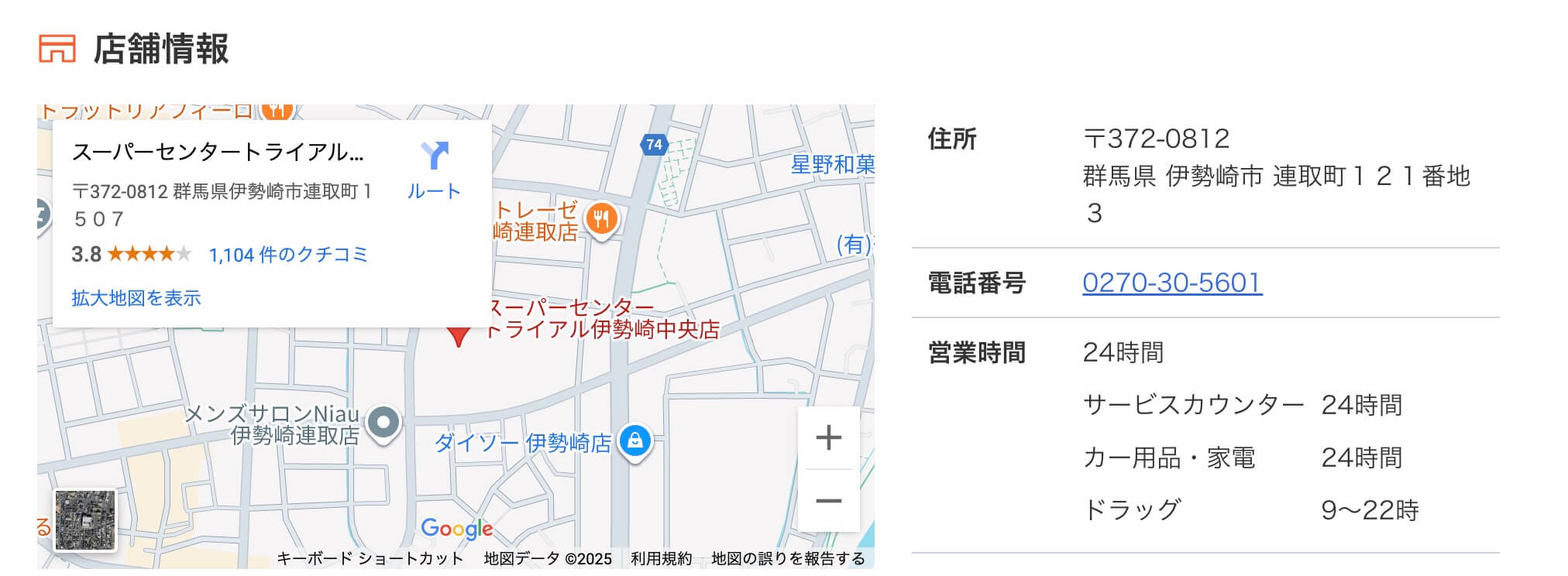 - 住所:群馬県伊勢崎市連取町121番地3 メガセンタートライアル 伊勢崎中央店 2階