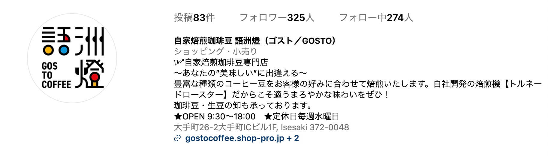 ただ名称に特徴があり、伊勢崎に「自家焙煎珈琲豆 語洲燈(ゴスト/GOSTO)」という自家焙煎珈琲豆専門店があるのでそちらの系列店なのでしょうか。