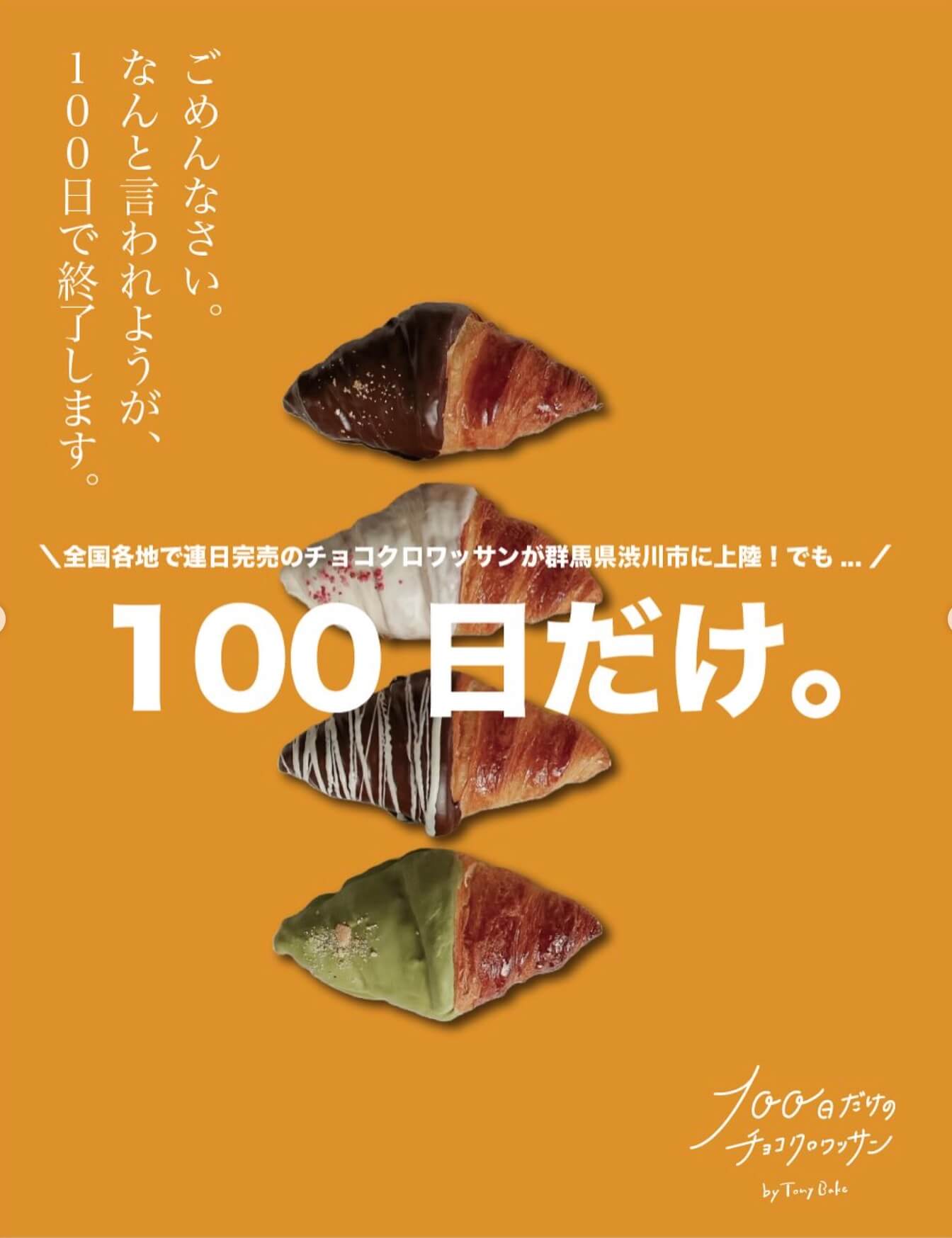 - 店名:100日だけのチョコクロワッサン by Tony Bake 群馬渋川店