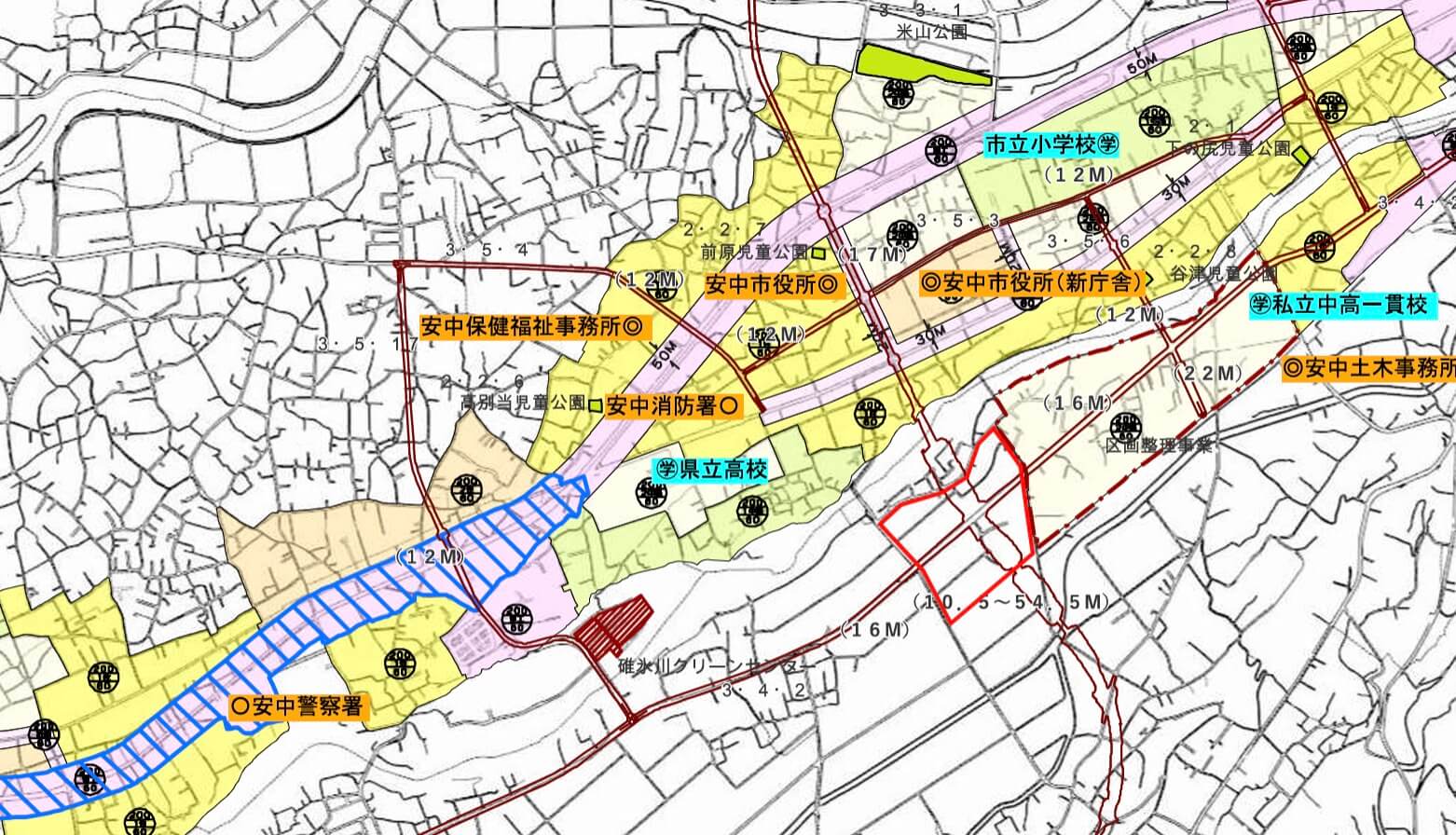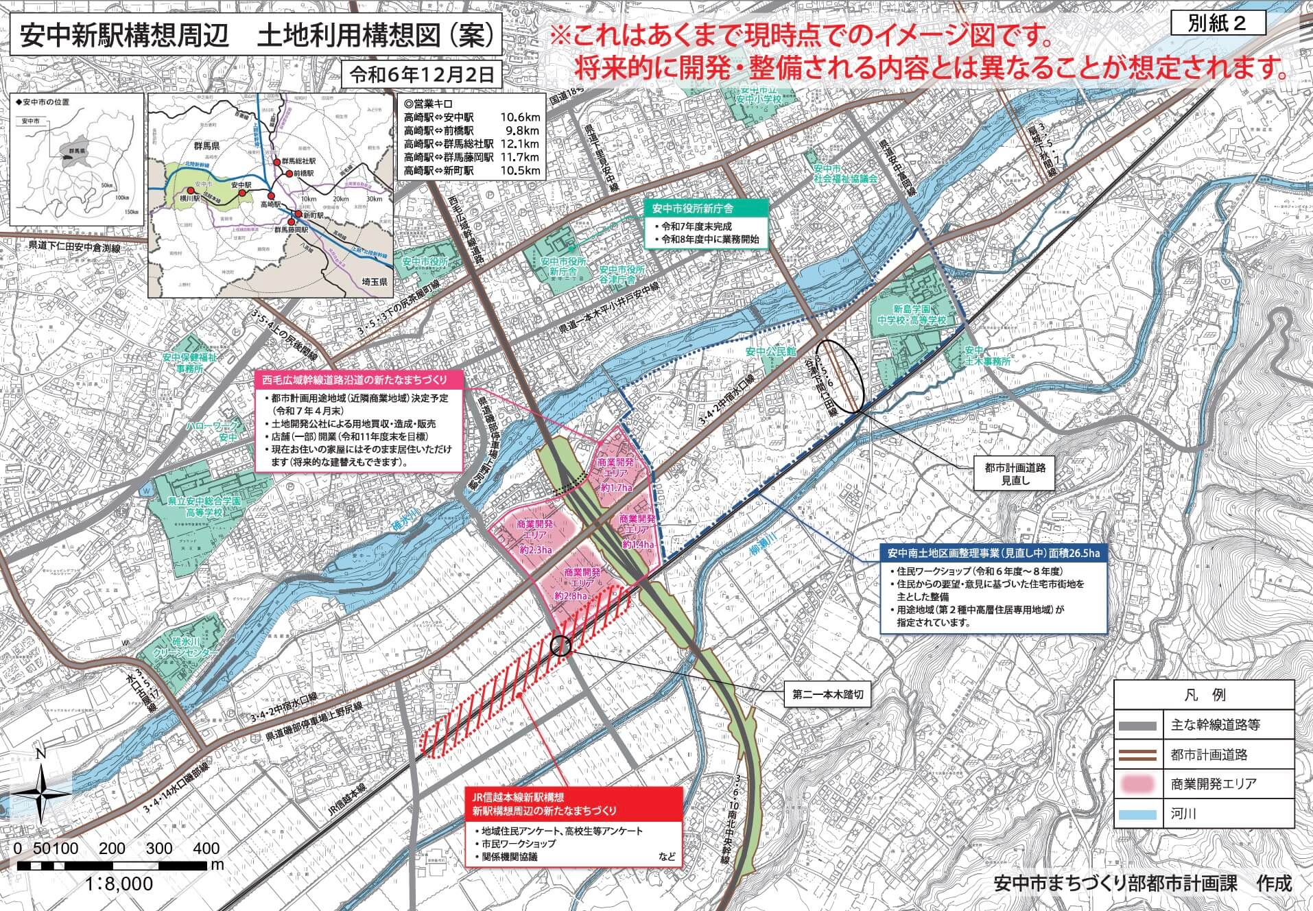 この開発エリアは、都市計画道路「中宿水口線」と「南北中央幹線」が交わる地点に位置し、東側は「安中南土地区画整理事業区域」に隣接、南側にはJR信越本線が走る交通の要所でもあります。