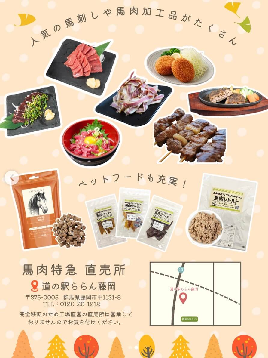 群馬県藤岡市中にある「道の駅ららん藤岡」に、馬刺し・馬肉専門店『馬肉特急 直売所 ららん藤岡店』が2025年10月25日に移転オープンしました。