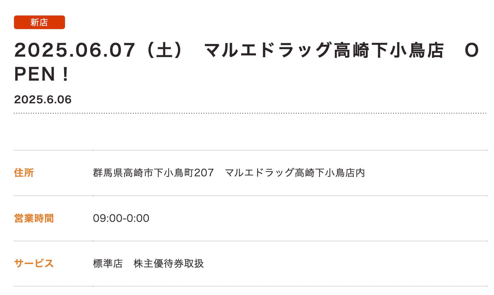 群馬県高崎市下小鳥町の「マルエドラッグ高崎下小鳥店」内に、『キャンドゥ マルエドラッグ高崎下小鳥店』が2025年6月7日(土)にオープンしたようです。