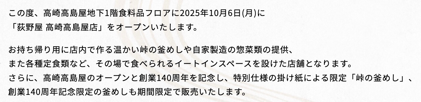 ▼『荻野屋 高崎高島屋店』オープンのお知らせ(荻野屋公式サイトより)