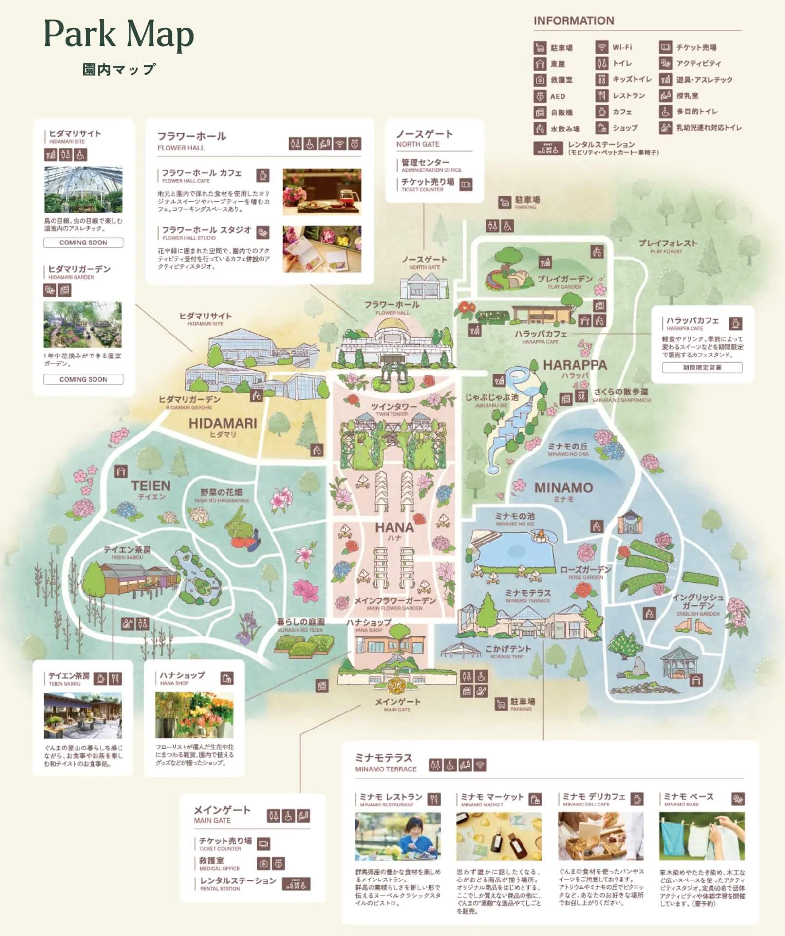 • HANAエリア:メインフラワーガーデン、花摘み体験、カフェが並ぶ中心エリア