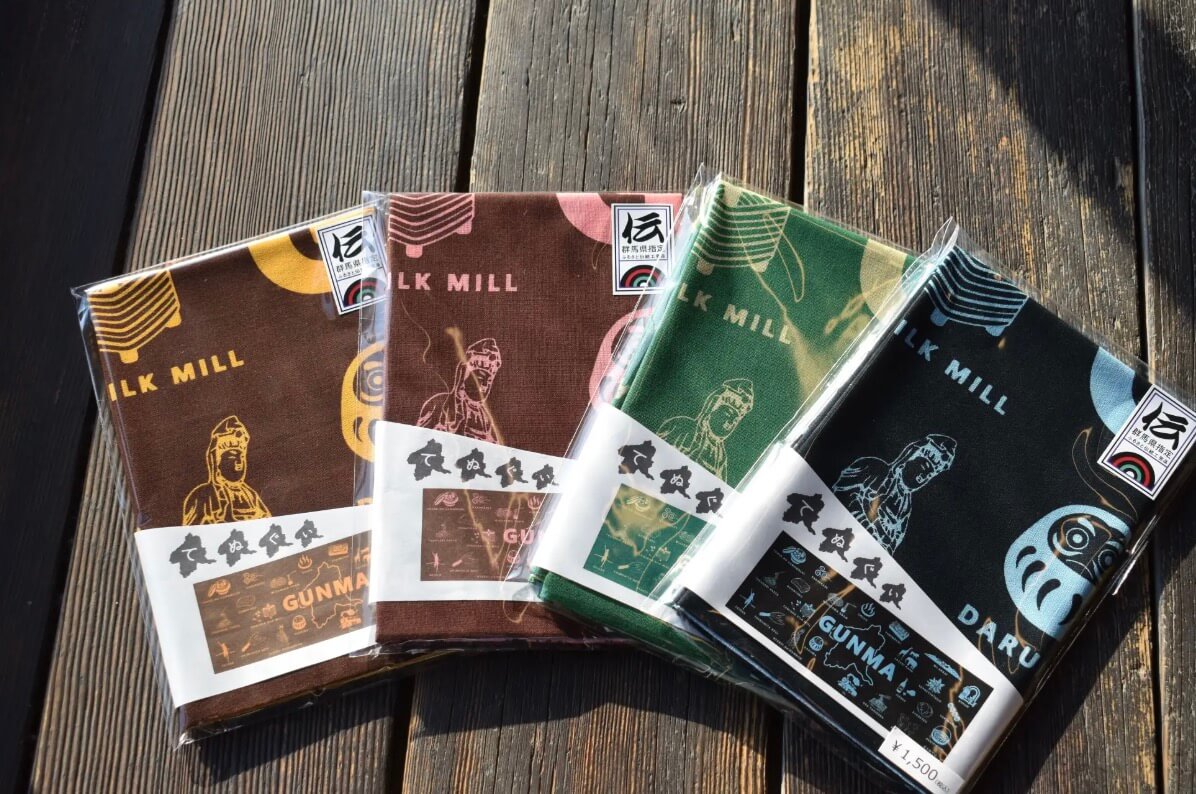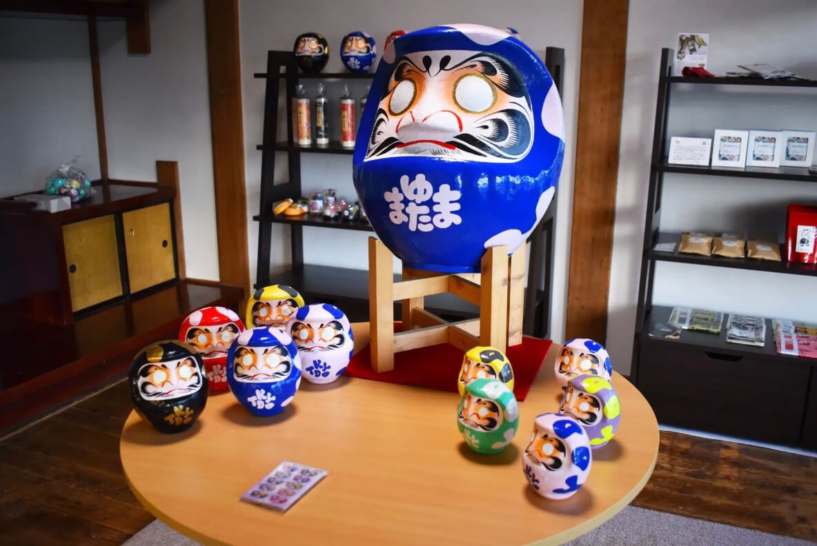 店舗では、伊勢崎銘仙ののれんが来訪者を迎えます。色鮮やかで繊細な柄は、地域に根差した織物文化を現代風にアレンジしたもの。さらに、アートブランドとのコラボによるオリジナルだるまも展示。深い青と柔らかなピンクを重ねた現代的なデザインが印象的です。