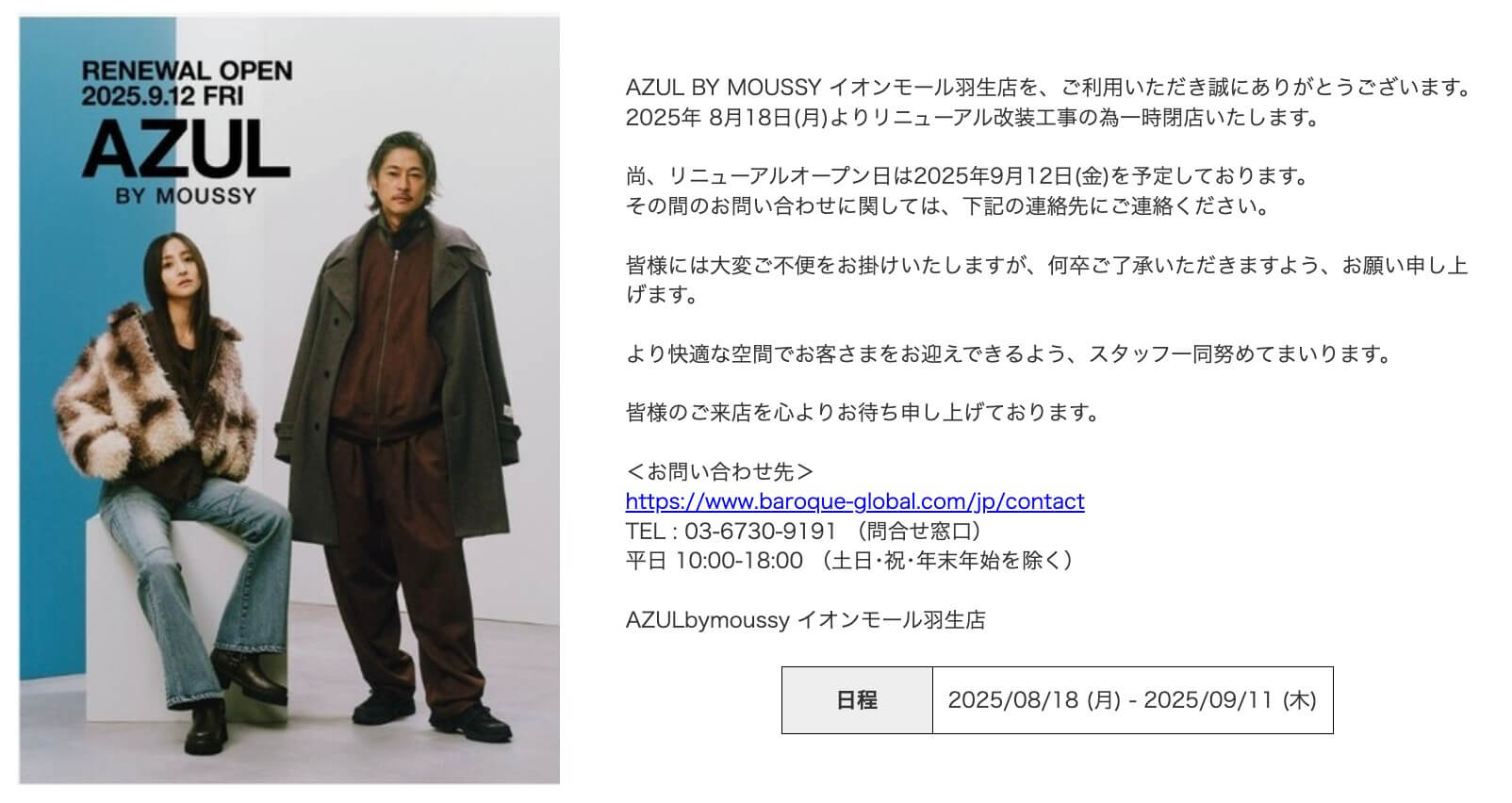 ファッションブランドAZUL by moussyは、9月12日のリニューアルオープンを予定しています。