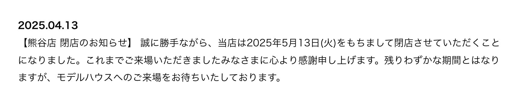 ▼『無印良品の家 熊谷店』閉店のお知らせ