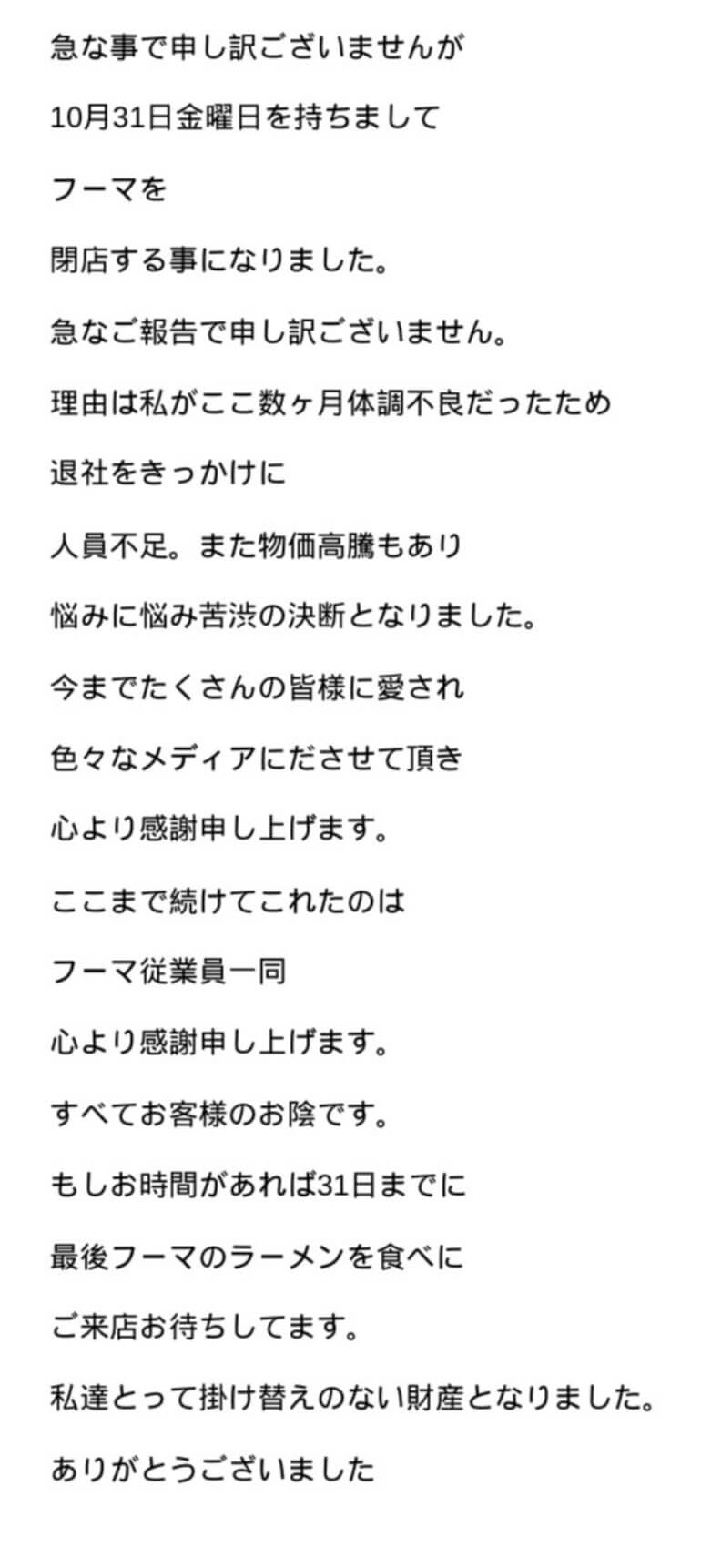 ▼『ラーメンフーマ』公式Xによる閉店のお知らせ