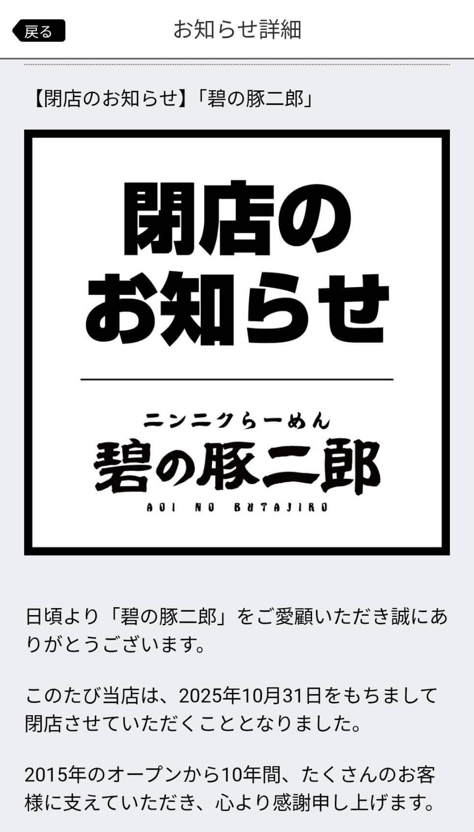▼『碧の豚二郎』閉店のお知らせ(景勝軒公式サイトによる)