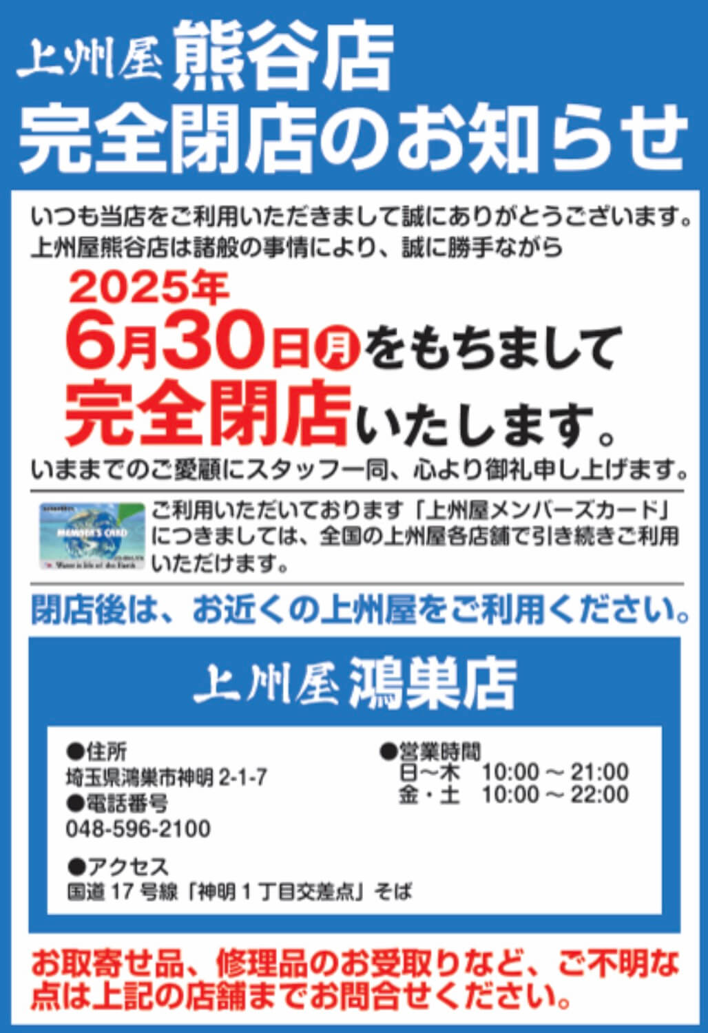『上州屋 熊谷店』が2025年6月30日(月)で営業終了へ