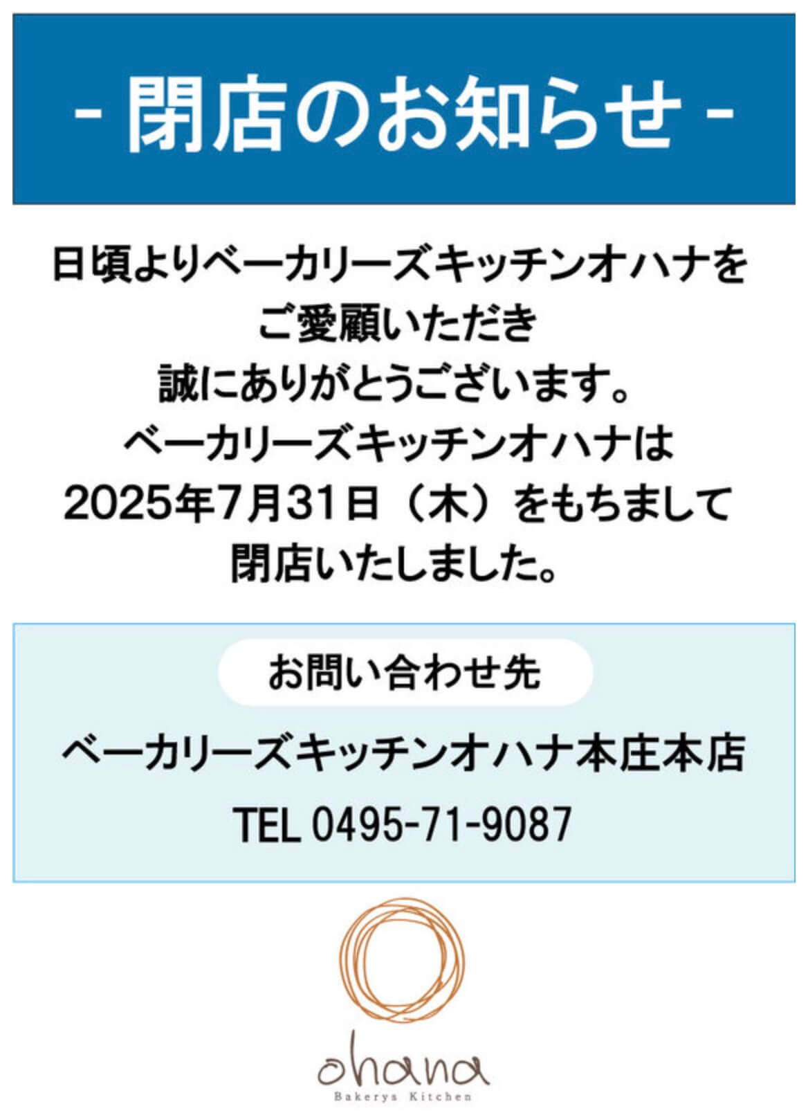 ▼「アズ熊谷」公式サイトによる『ベーカリーズキッチンオハナ アズ熊谷店』閉店のお知らせ