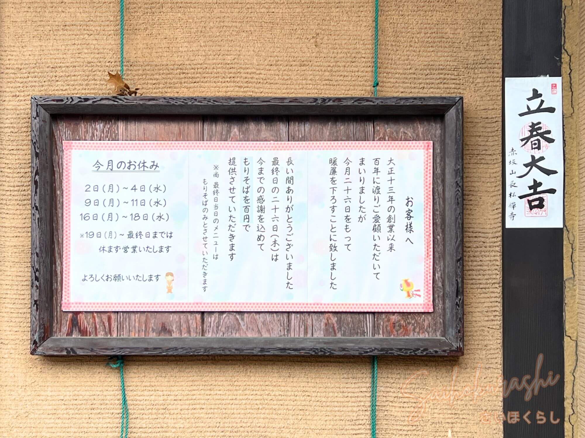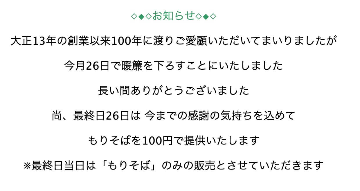最終営業日には、感謝の気持ちを込めて「もりそば」が100円で提供されるとのこと。