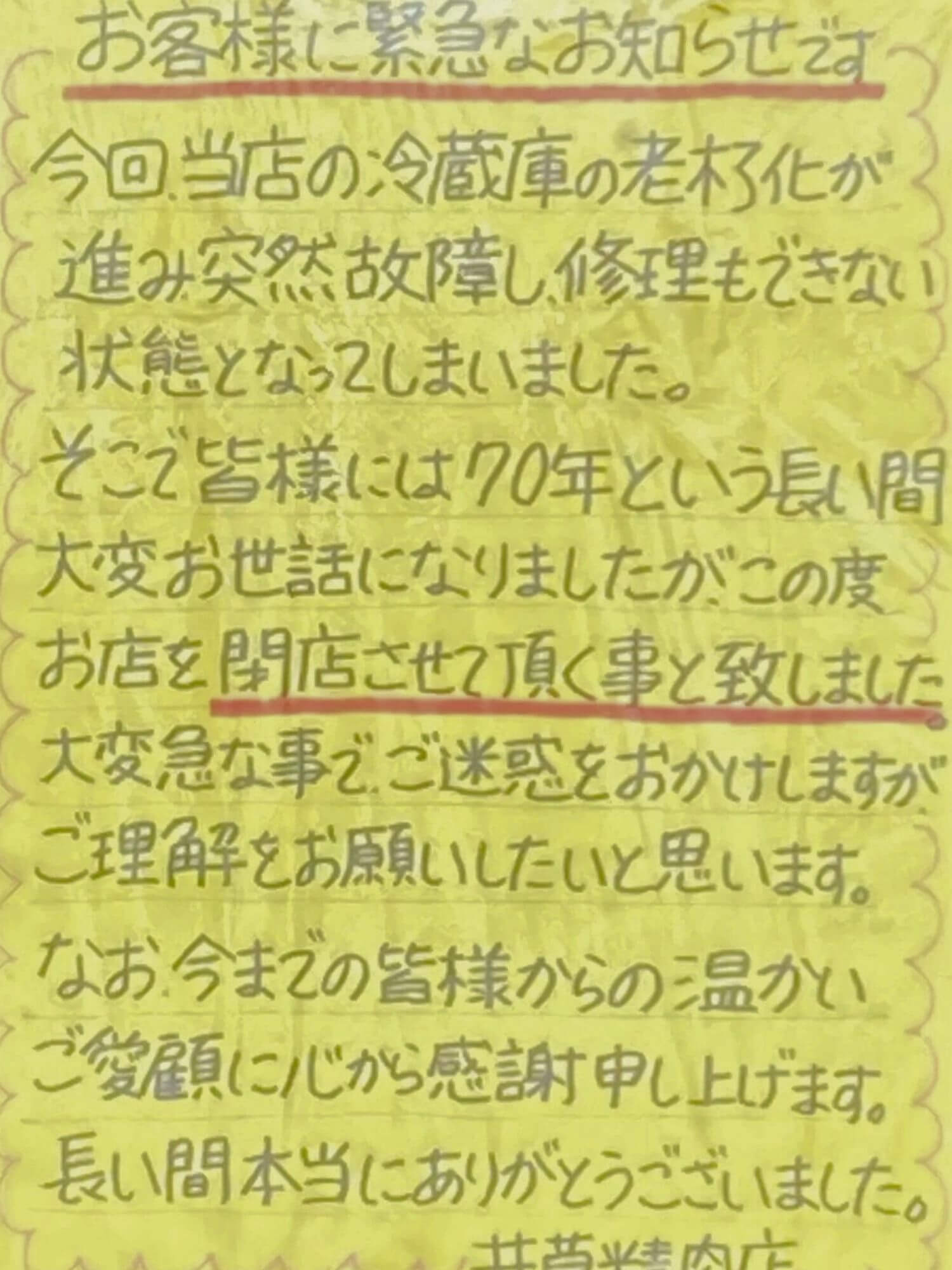 店舗の掲示によると、閉店の理由は冷蔵庫の老朽化と故障によるもので、やむを得ない事情で営業を続けられなくなったとのことです