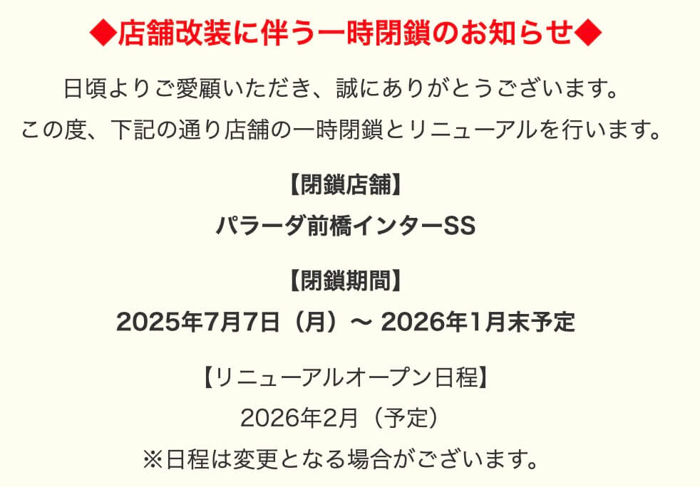 >前橋インター近くで営業していたガソリンスタンド『apollostation パラーダ前橋インターSS』が、店舗改装に伴い一時閉鎖となっています。