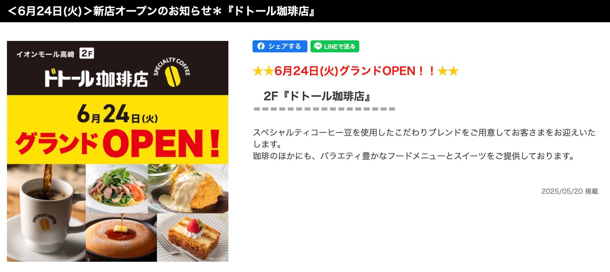 【新店】2025年6月24日オープン!市内にはなかったドトール!高崎市棟高町「イオンモール高崎」内にカフェの『ドトール珈琲店 高崎店』がオープン予定!【開店】