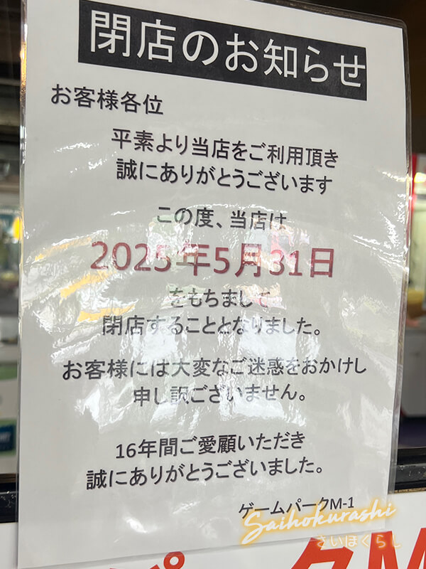 ▼『ゲームパークM−1』に掲示された閉店のお知らせ