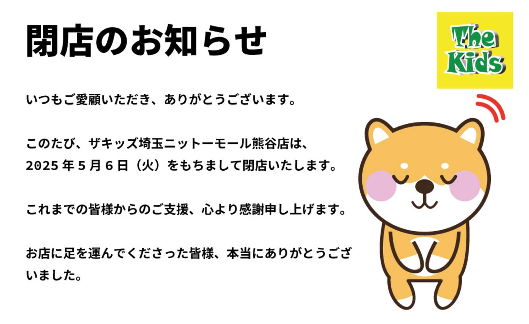 ▼『The Kids(ザキッズ) 埼玉ニットーモール熊谷店』閉店のお知らせ