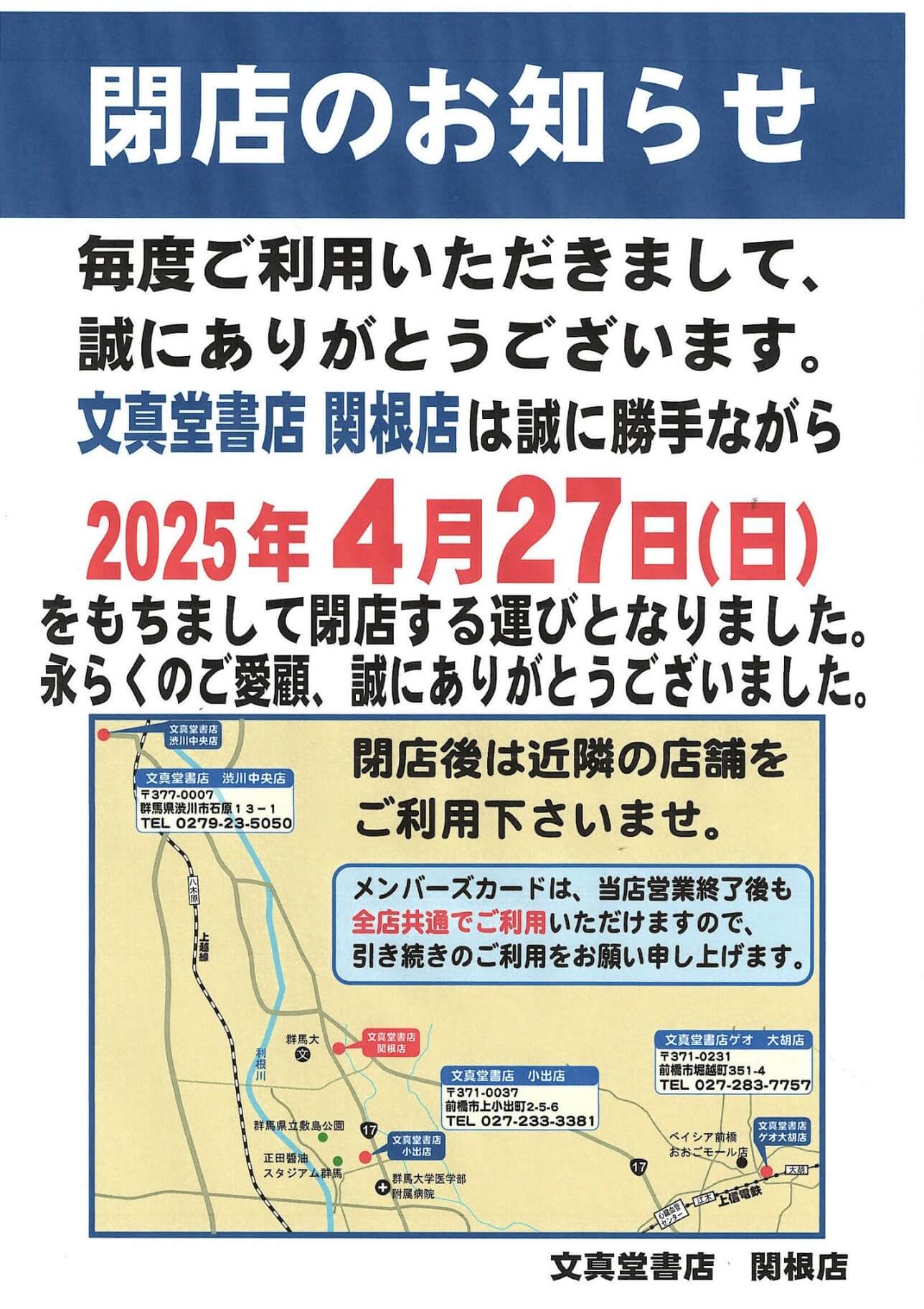 ▼『文真堂書店 関根店』閉店のお知らせ ※公式Xより