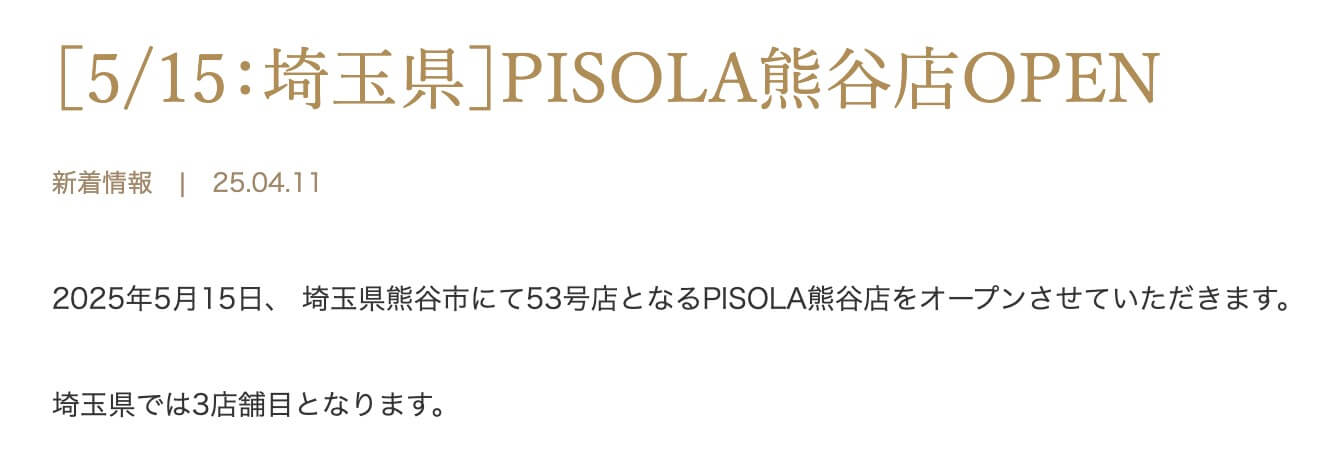 ▼『PISOLA(ピソラ)熊谷店』公式HPによるお知らせ