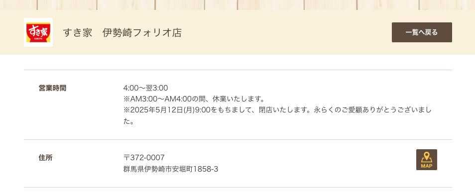 近隣にある「すき家 伊勢崎フォリオ店」の動向ですが、こちらは新しい店舗のオープンに先立ち、2025年5月12日(月)午前9時をもって閉店することがすき家公式サイトで告知されています。