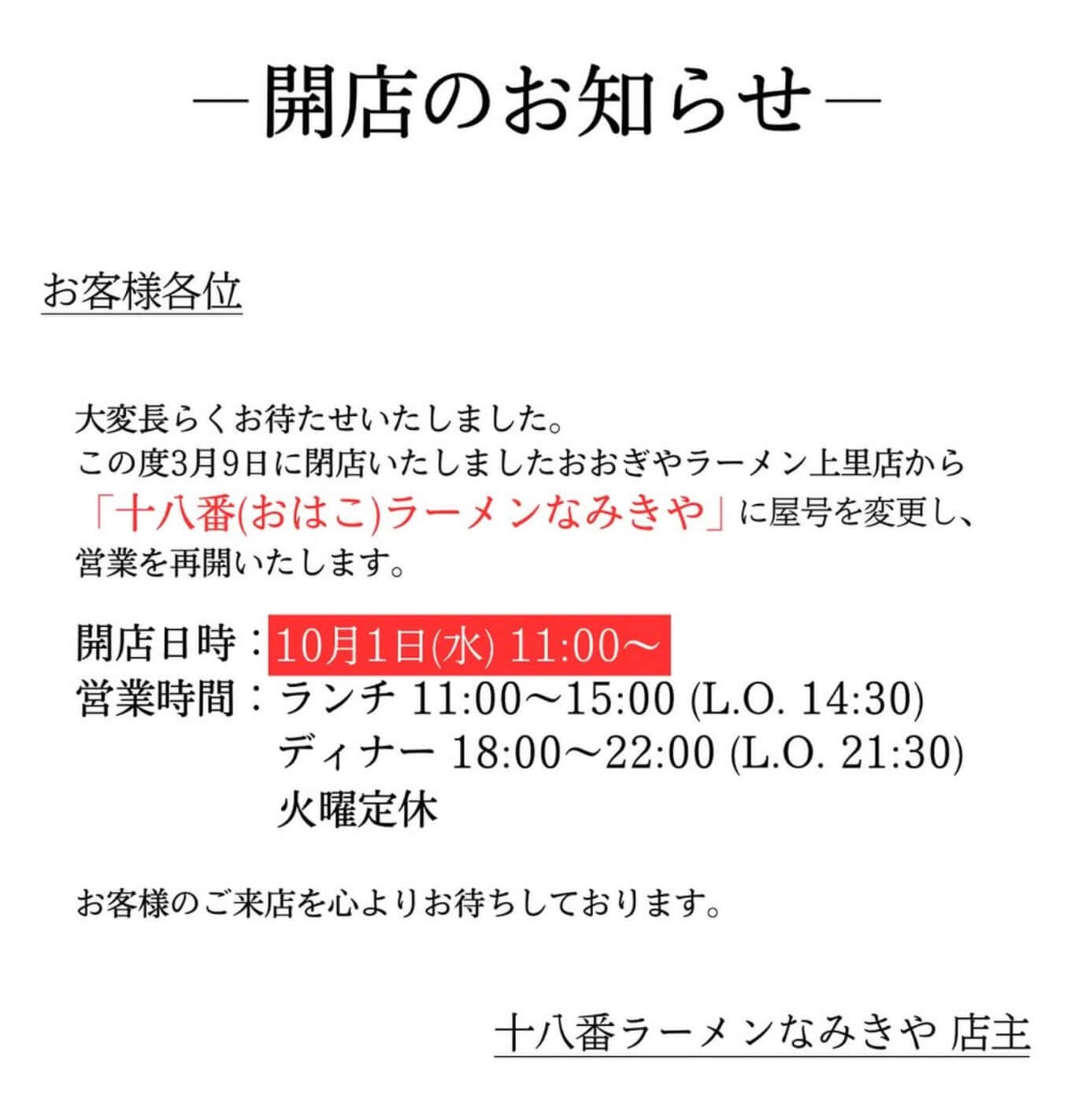 【新店】【9/27追記:2025年10月1日オープン予定!】メニューはどうなる!?「おおぎやラーメン 上里店」跡地で『十八番ラーメン なみきや』が新規オープン予定!