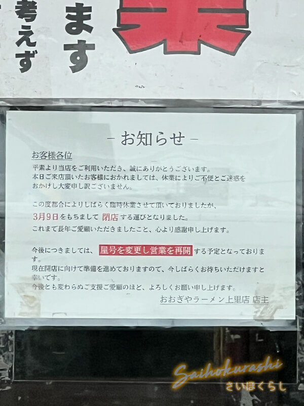 2025年3月9日をもって閉店した「おおぎやラーメン 上里店」。