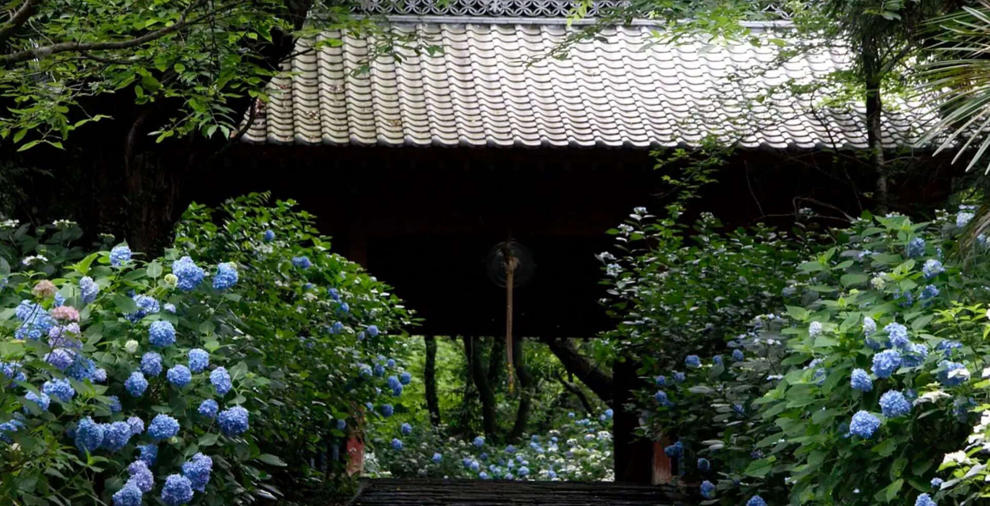 歴史を感じるお寺の境内に咲くアジサイは、静かで落ち着いた雰囲気に優しく溶け込んでいます。