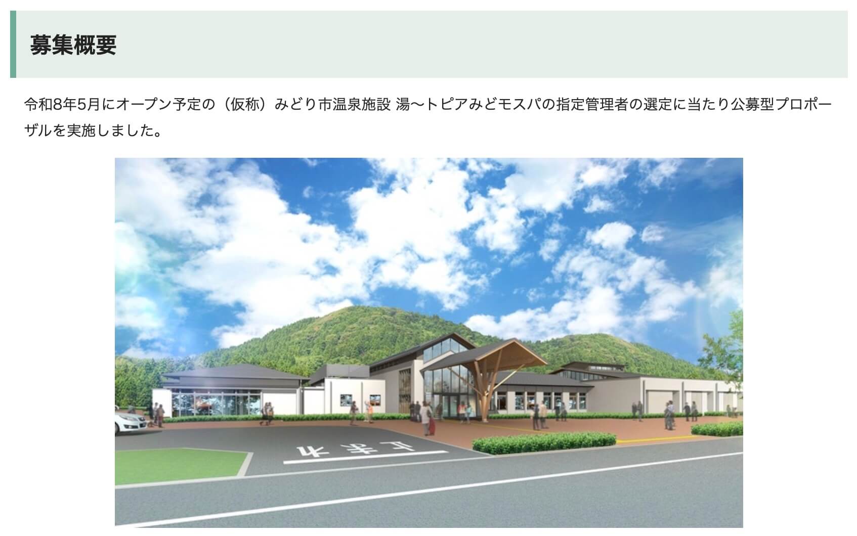 指定管理者公募型プロポーザルの実施された際に公開されたみどり市の公式ウェブページには、”令和8年5月にオープン予定の(仮称)みどり市温泉施設 湯~トピアみどモスパ”と記載がありました。