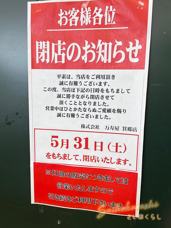 そして今回、『万寿屋 箕郷店』も閉店予定となっており、万寿屋グループの再編または事業縮小の流れがさらに進んでいる印象です。