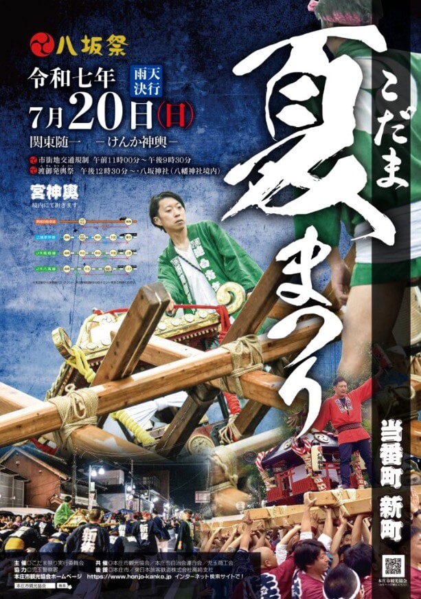 本庄市児玉町の市街地を舞台に、威勢のいい掛け声とともに神輿が練り歩く夏の恒例行事。関東随一と称される「けんか神輿」は、迫力満点のぶつかり合いが見どころです。
