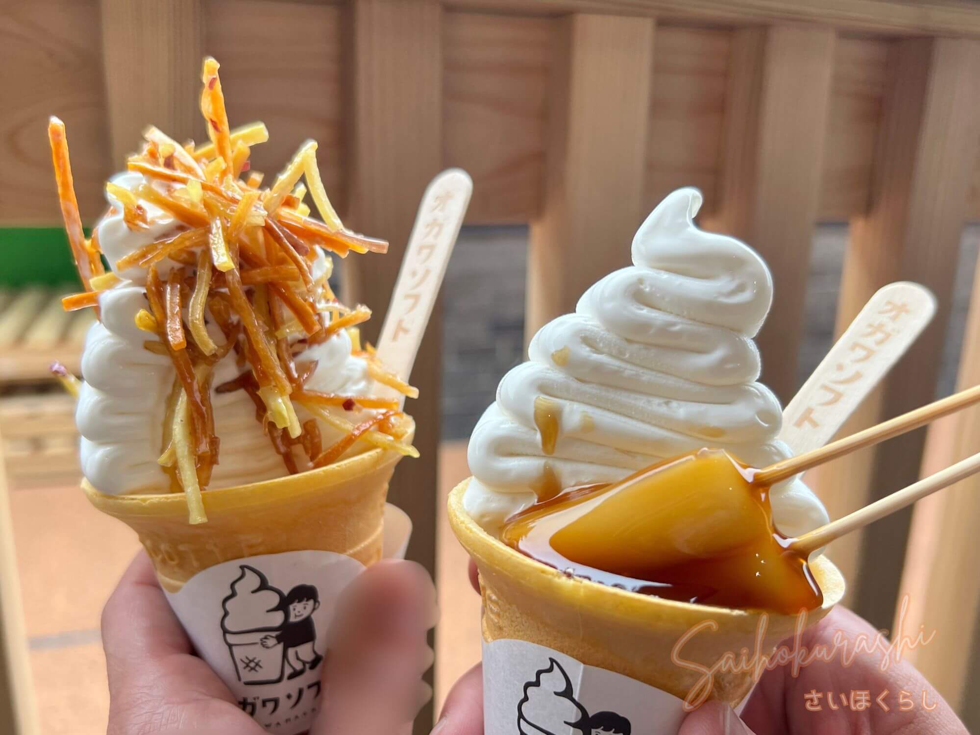 「ミニみたらしだんごソフト(450円)」「はりはりおいもケンピソフト(500円)」を実食してみました。