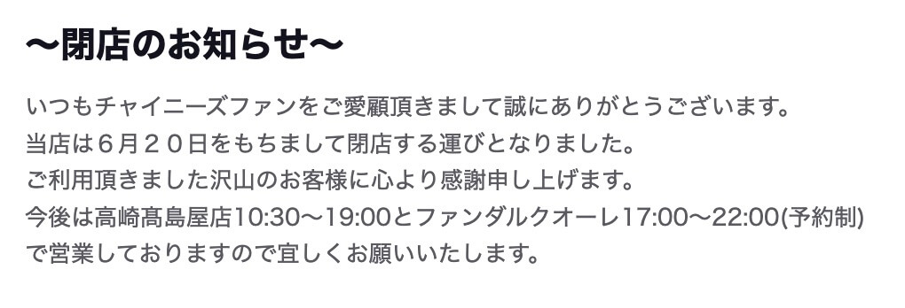▼『チャイニーズファン ホテルココグラン店』閉店のお知らせ
