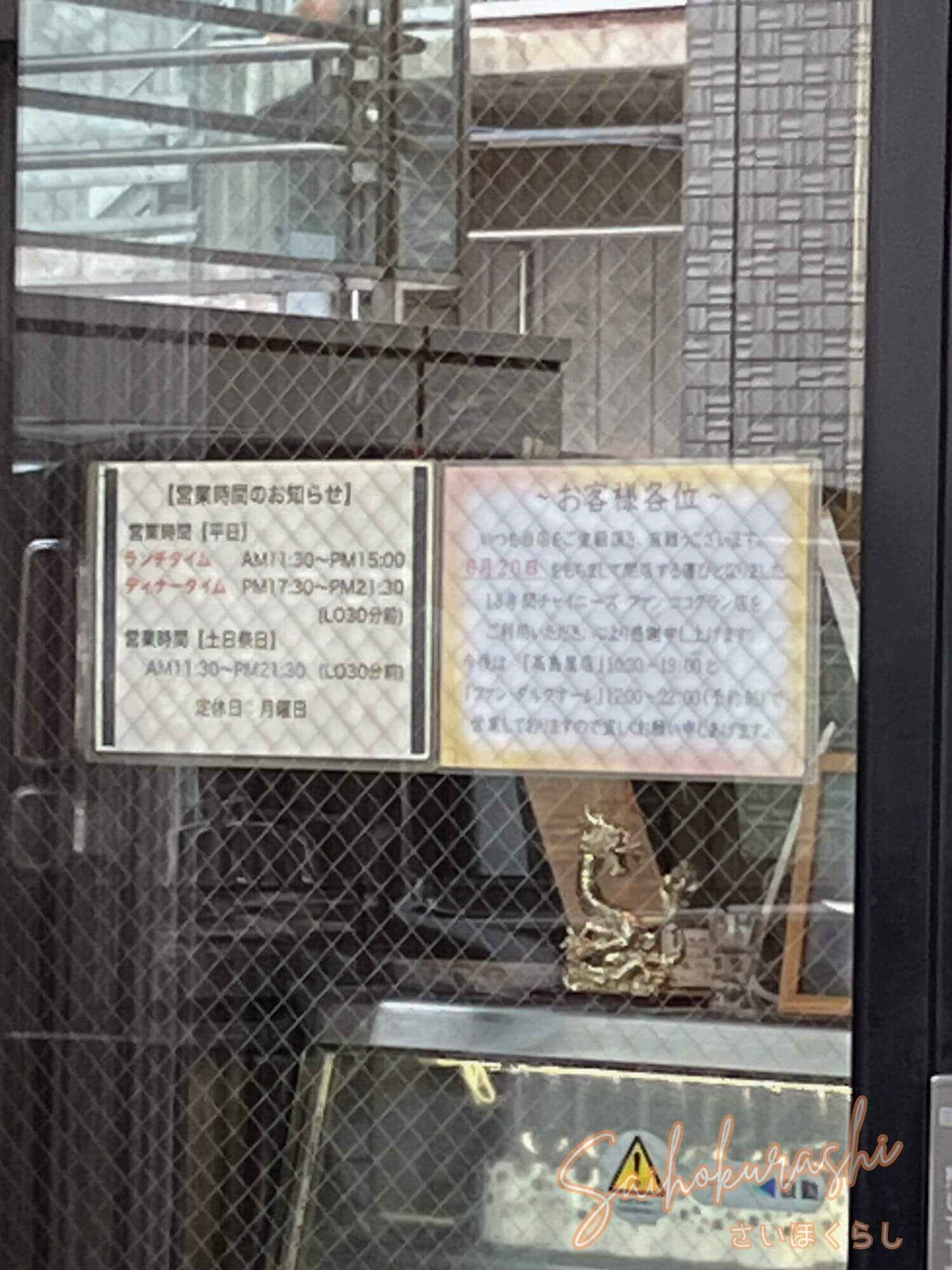 高崎駅東口からすぐ、ホテルココグラン高崎の1階にある『チャイニーズファン ホテルココグラン店』が、2025年6月20日をもって閉店してしまうようです。