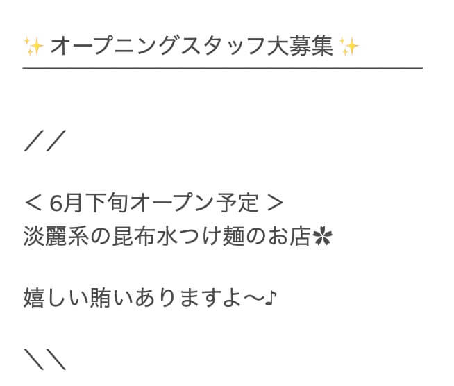 オープンは2025年6月下旬オープン予定を予定しており、昆布水を使った淡麗系つけ麺を提供する新しいラーメン店とのこと。