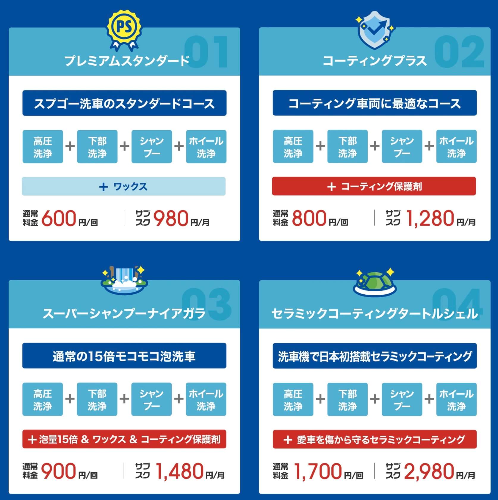 ※スーパーシャンプーナイアガラ/セラミックコーティングタートルシェルは「新前橋店・高崎棟高店・太田新田店」のみ提供。※コーティングプラスは撥水系コーティング施工車向けのコースです。