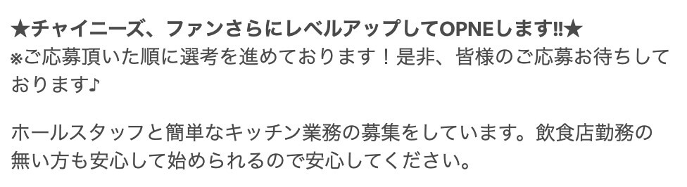 今回、某求人サイトにて「チャイニーズファン」のオープニングスタッフ募集情報が掲載されていました。