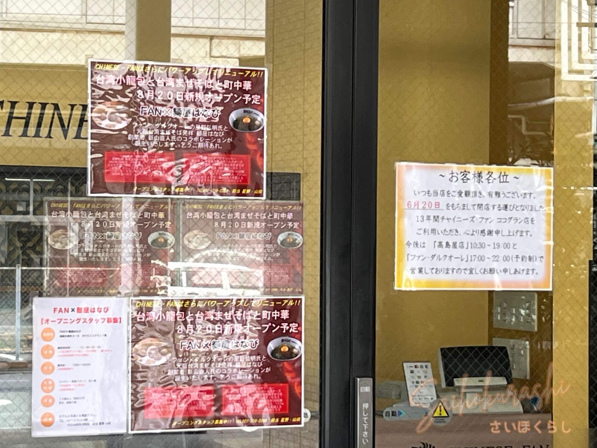 「リニューアルオープン」という表記からすると、以前の「チャイニーズファン ホテルココグラン店」が再開なのかも?しれません。