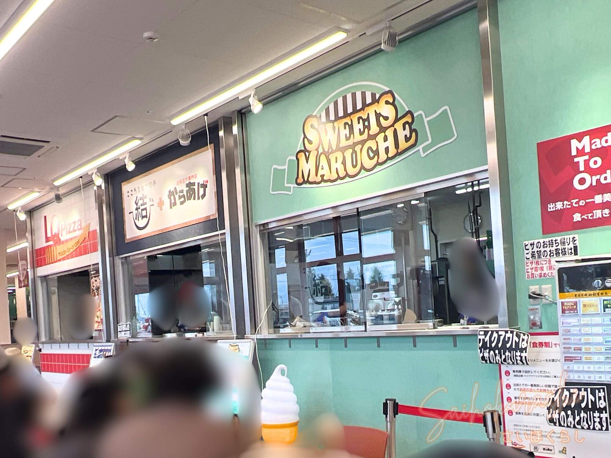 ▼会計の奥にはちょっとしたフードコートスペースも。