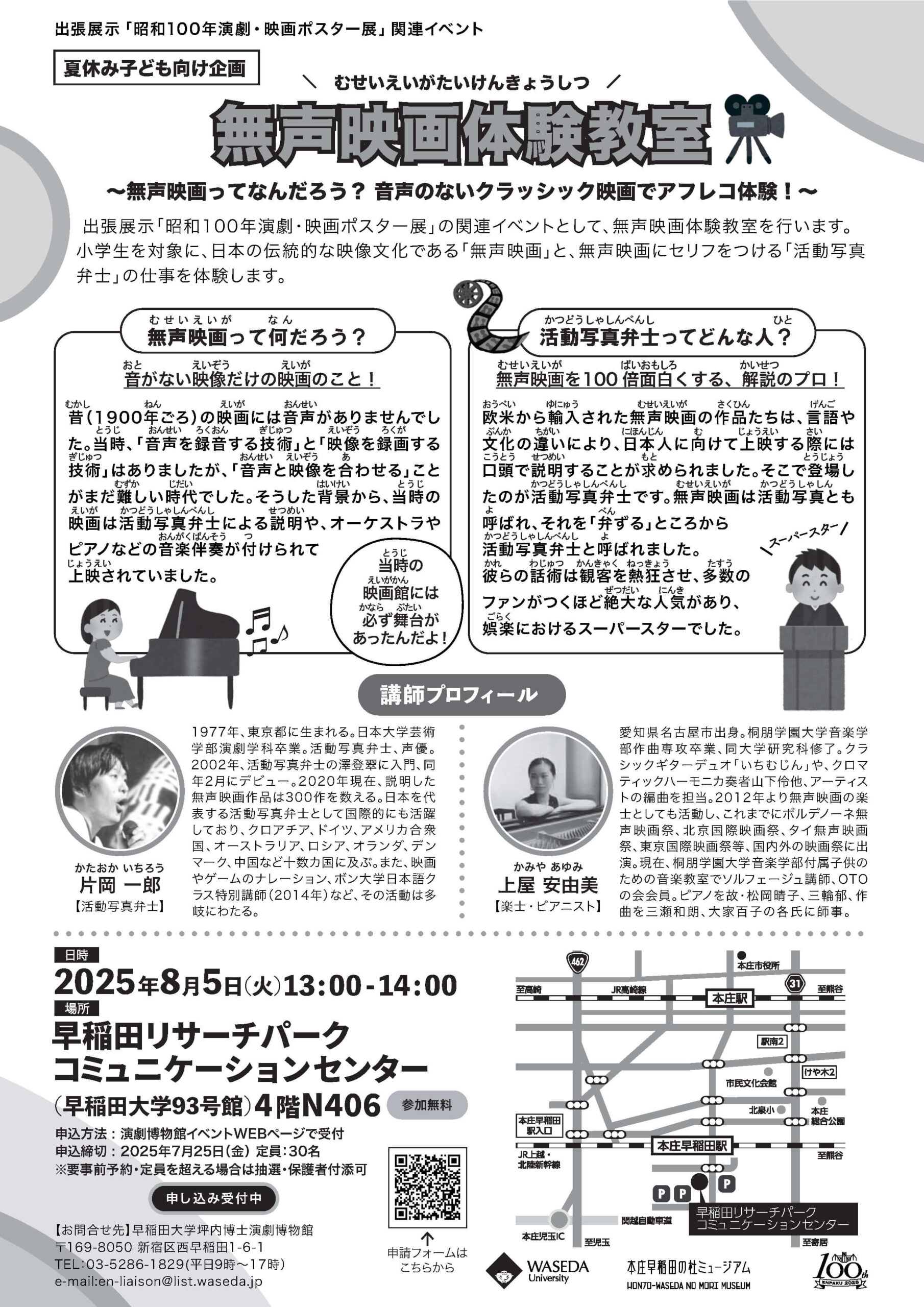 活動写真弁士や楽士の仕事を体験しながら、無声映画の魅力に触れられる特別な教室。夏休みの自由研究にもおすすめです!