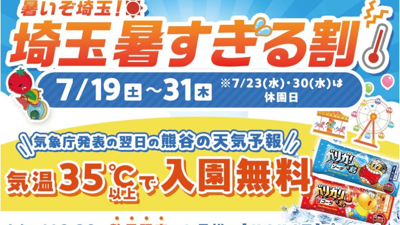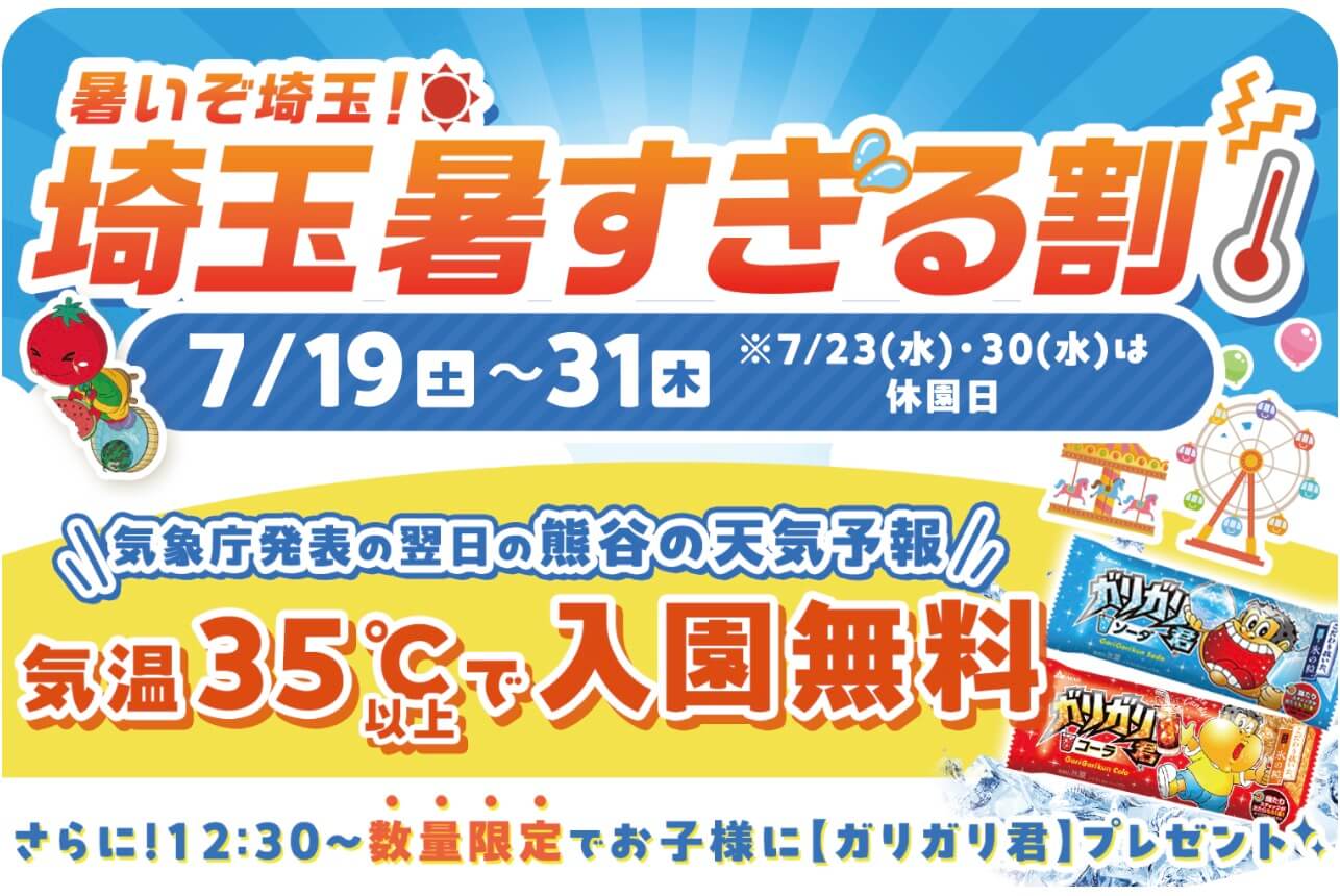 期間中、前日11時または17時に発表される「熊谷」の予想最高気温が35℃以上だった場合、翌日の入園料がなんと無料になる『埼玉暑すぎる割』が開催です!