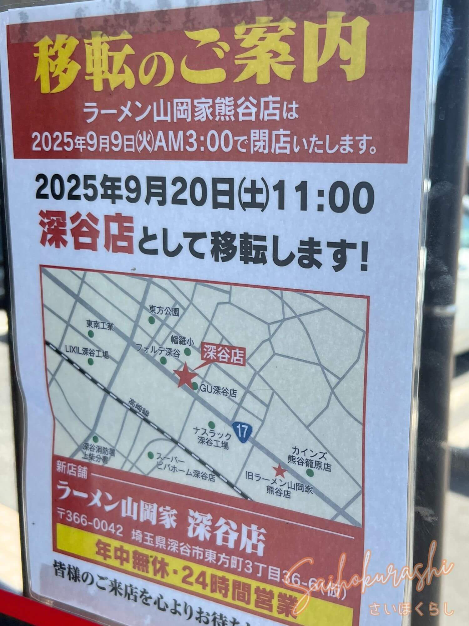 国道17号沿いの24時間ラーメン店として親しまれてきた『ラーメン山岡家 熊谷店』が、深谷市へ移転することがわかりました。